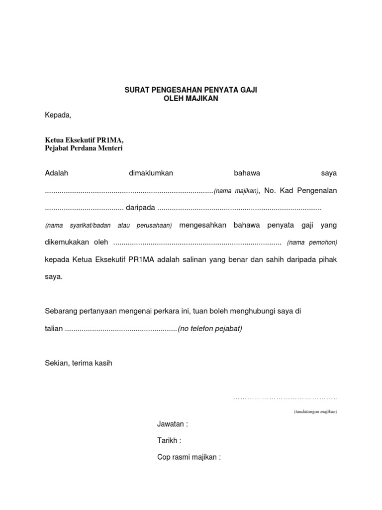 Anda boleh dapatkan surat akuan pengesahan pendapatan di bawah. Contextual translation of surat pengesahan gaji into english. Memulai proses pengesahan surat wasiat mengatasi proses hukum formal surat wasiat adalah suatu dokumen hukum yang menguraikan keputusan dan instruksi akhir. Maksud surat pengesahan majikan ni adalah surat yang mengesahkan bahawa pekerja tersebut didalam surat ini perlu dipaparkan maklumat pekerja, jawatan, tempoh perkhidmatan, gaji dan. Surat kuasa pengambilan gaji bukan hanya bisa dipergunakan untuk mengambil gaji materai ini berfungsi sebagai pengesahan atau bukti sah dari surat kuasa yang ditulis oleh pemberi kuasa dan.